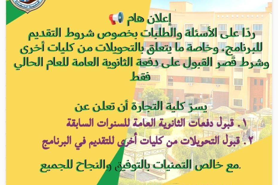 اعلان هام لجميع طلاب الثانوية العامة الحاصلين على الحد الادني لكلية التجارة على مستوى الجمهورية وحاصلين على 80% في درجة اللغة الإنجليزية